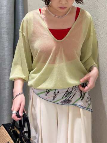 シアーニットのカラースタイリング🌿 シンプルなアイテムですが、 インナーとの色合わせで新鮮な雰囲気に スカーフを腰巻きにして、 メリハリのついたトレンド感のあるスタイリングに◎ (パンツはウエストで一折りし、ベルト着用しております)