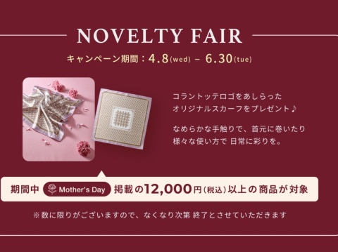 いつもコラントッテオフィシャルショップを ご利用いただきまして誠にありがとうございます😊 コラントッテから 母の日キャンペーンのご案内です💁♀️ 4/8(水)〜5/10(日)の期間中、 コラントッテHP「Mothers Day」掲載の¥12.000(税込)以上の商品をお買上げお客様に、 コラントッテロゴをあしらったオリジナルスカーフをプレゼント🎁🧣 なめらかな手触りで、様々な使い方が楽しめるデザインとなっております✨ 日頃頑張っているお母様へ、血流改善の効果がある 磁気製品のギフトはいかがでしょうか💝🎉 ぜひ4階コラントッテにお越しくださいませ ※プレゼントには数に限りがございます